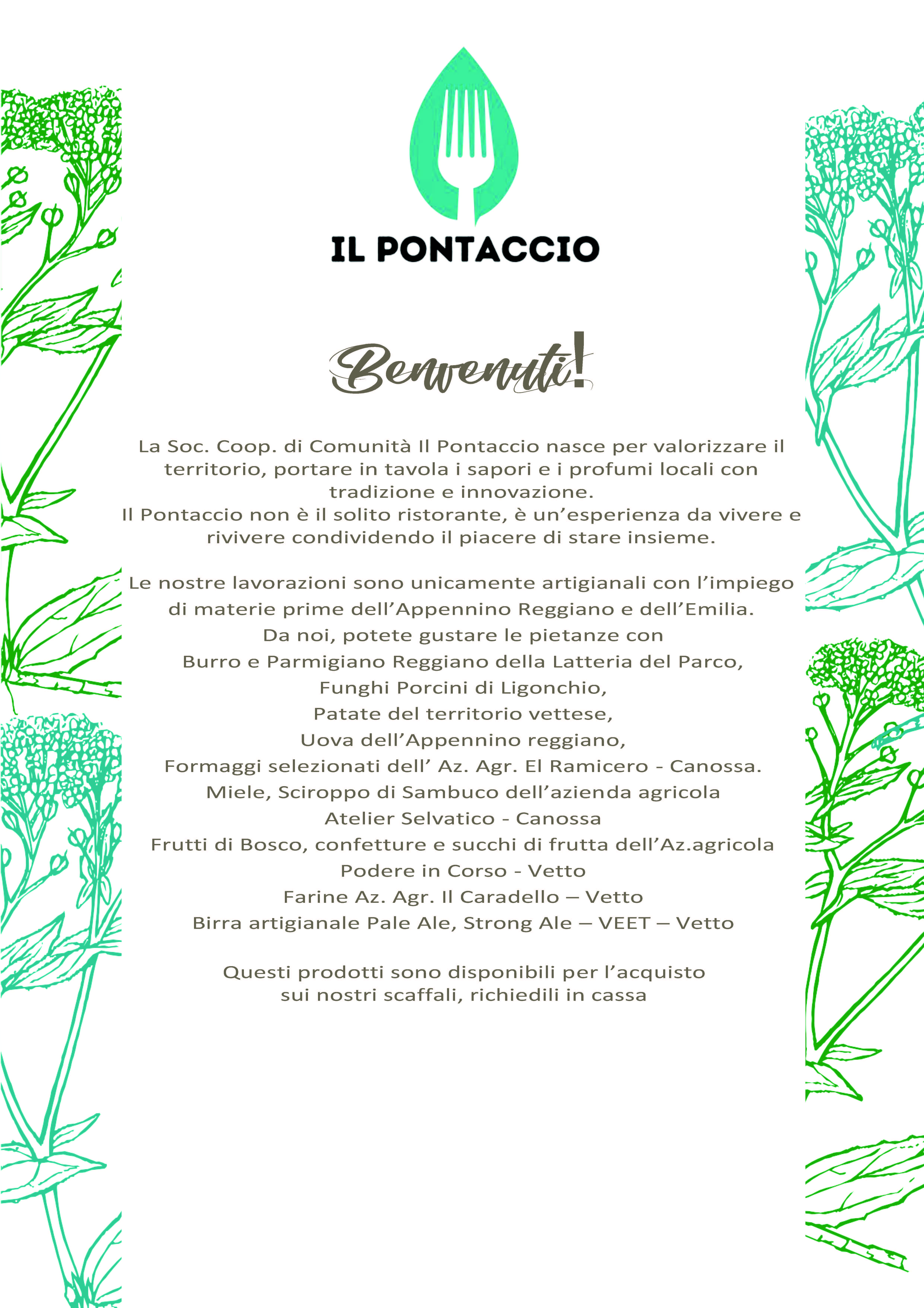 Il Ristorante è stato il primo locale aperto dalla Soc.Coop.Soc. Il Pontaccio a Vetto. Il luogo d'incontro perfetto per chiacchierare e stare bene a tavola con il gusto del territorio insieme ai più di 50 soci che ad oggi si sono uniti a questo progetto.